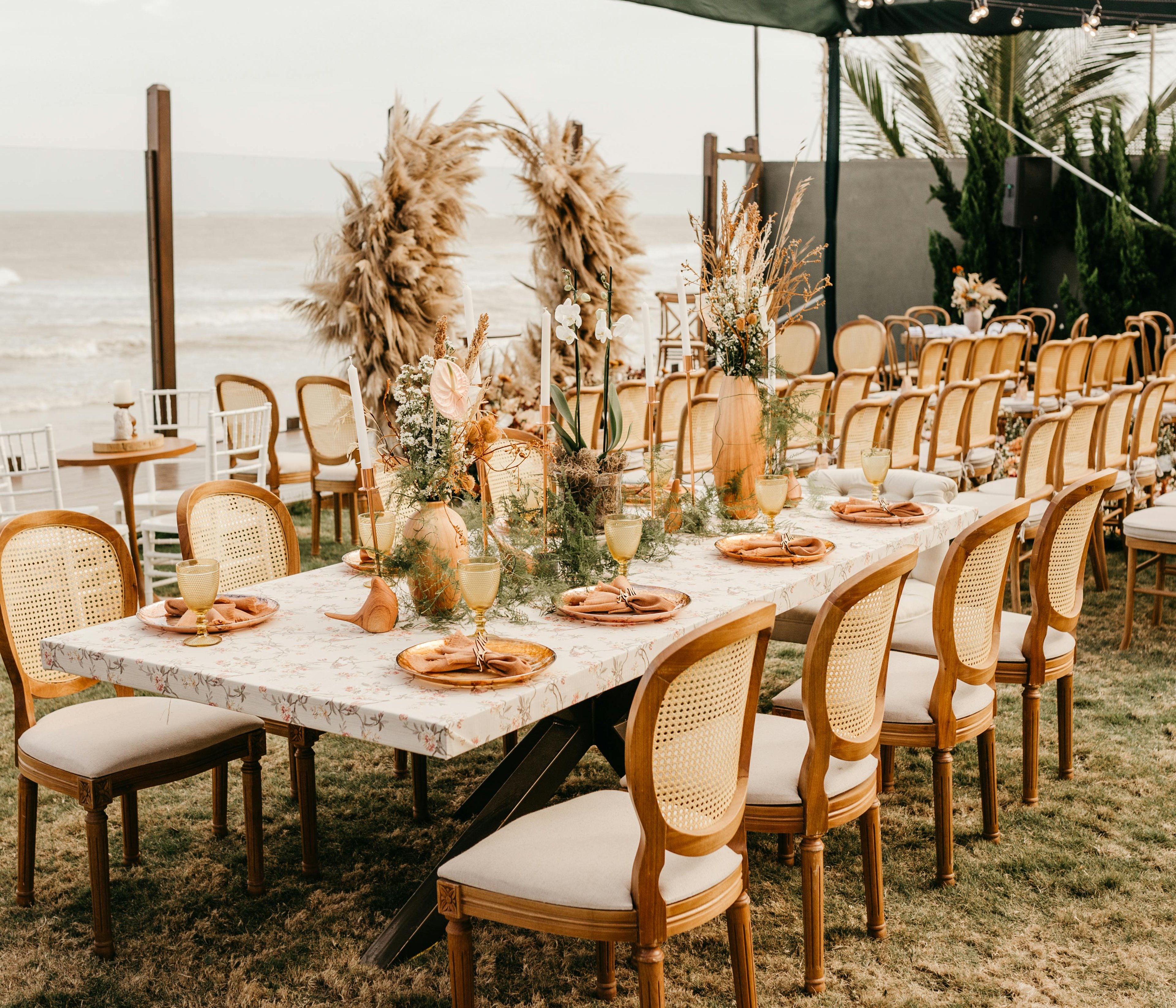 For a bohemian feel, try earthy, muted colour palettes and tons of greenery in clear glasses. You can even go rustic – bright white, raw linens, paired with textured natural fabrics, candles, warm wooden beams and twinkling fairy lights.