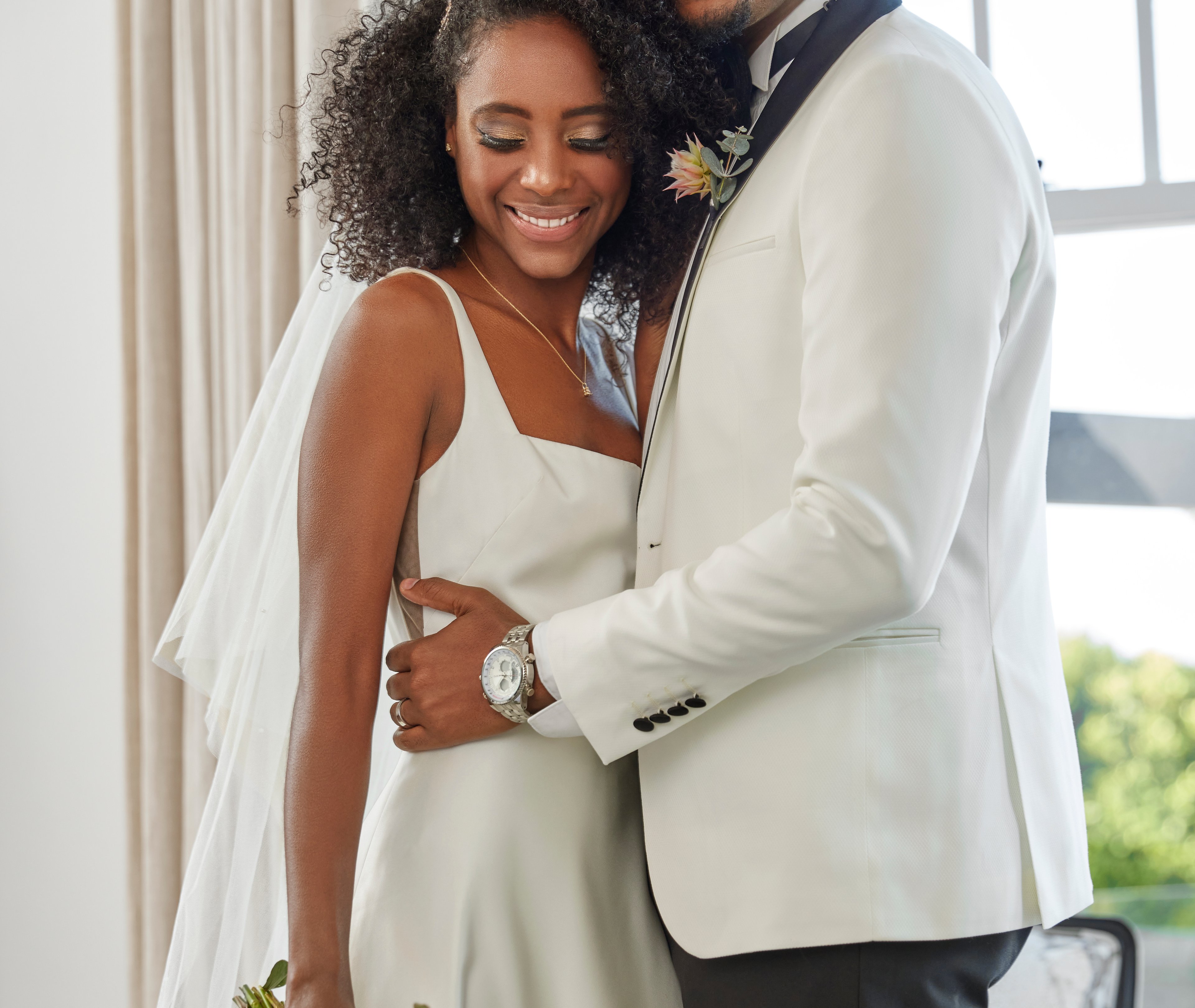 A formal dress with pearl detailing, and other gems to add shimmer, shine and extravagance. And for him? A classic tux.